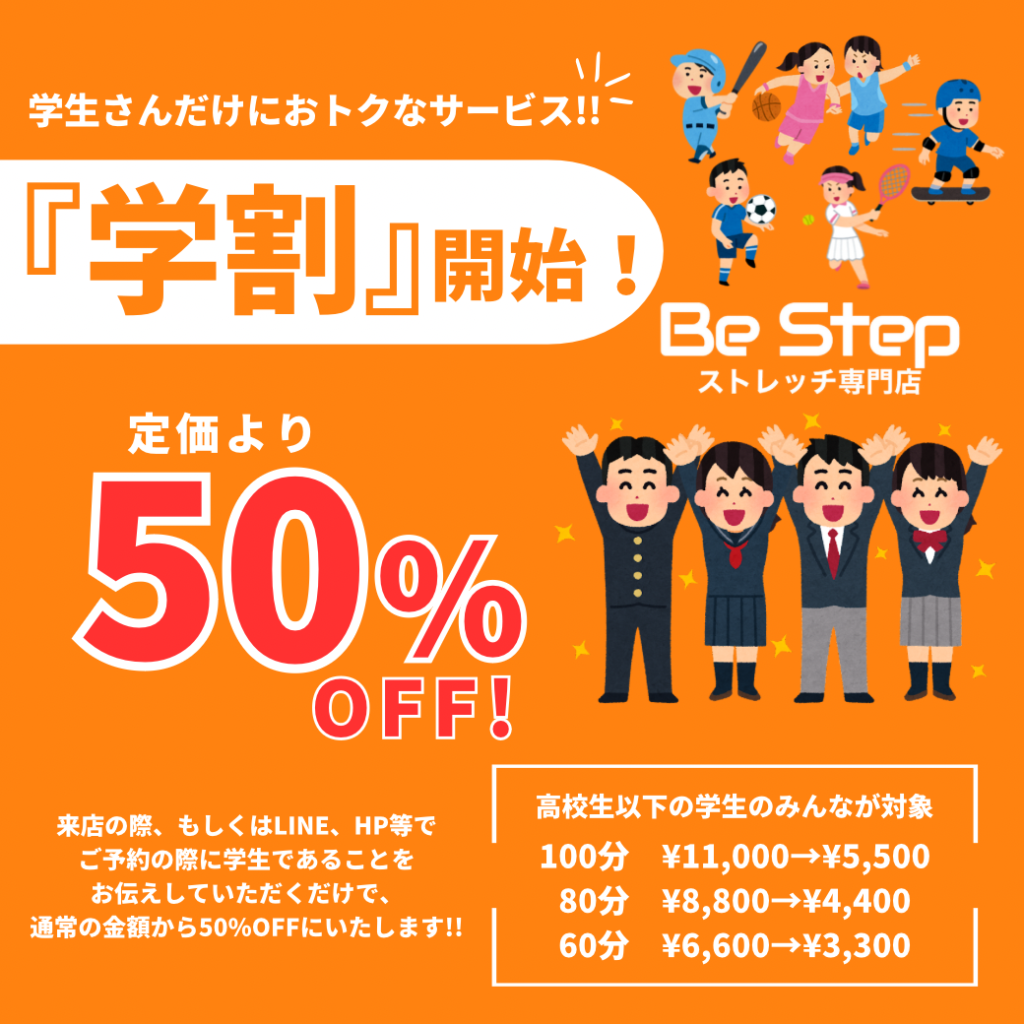 この度、『学割』を開始いたします😊 内容としましては、 ●高校生以下の学生が対象です‼️ ●定価の半額でストレッチを受けれます💪 100分¥11,000→¥5,500 80分 ¥8,800→¥4,400 60分 ¥6,6 […]